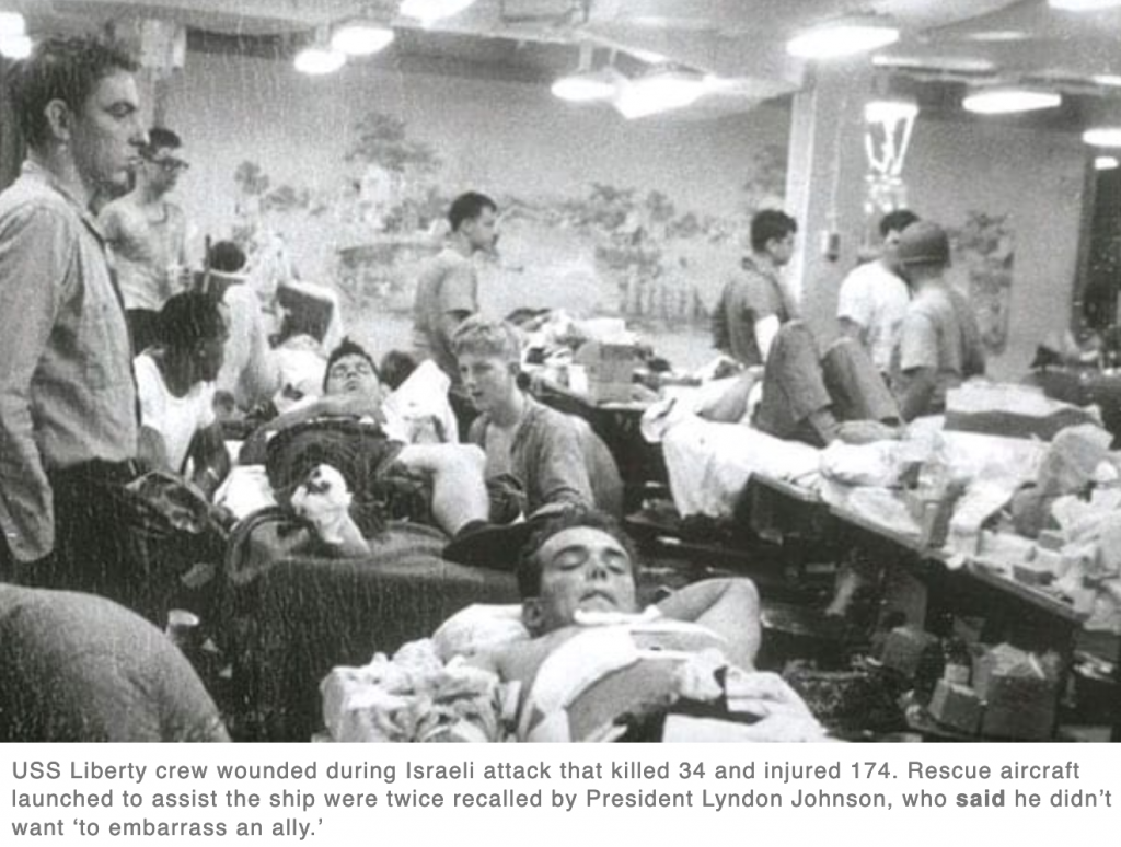 Attacked by a jet? Singular? The USS Liberty, an unarmed intelligence gathering ship, was attacked by multiple Israeli jet fighters and three Israeli torpedo boats on a clear, calm day with unlimited visibility. The jets napalmed our servicemen who’d been sunbathing on deck. Strafed the decks. Jammed the emergency distress channels. Blasted hundreds of holes in her, killed 34 sailors and marines, wounded over 170. Through superb seamanship, Captain McGonagle dodged four torpedoes with his burning ship before a fifth blew a hole in her below the water line that was bigger than a school bus. Even then, under McGonagle, the officers and crew fought to save the vessel while Israeli gunners shot at our sailors lowering life rafts in case the ship rolled. [More info & citations here]