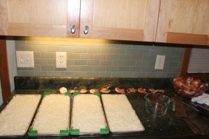 Trays: Don’t use abrasive scrubbers on them. Consider buying an extra set of trays. They don’t cost much. If you mess one up, step on it, lose it, whatever, you don’t have to do short batches until a replacement arrives. You can also get the next batch freezing in the chest freezer while you’ve got one going in the freeze dryer. Trays clean up nicely in the dishwasher. It helps to soak them a few minutes first. They collect some water under the rims so tip them up on edge to drain after washing.