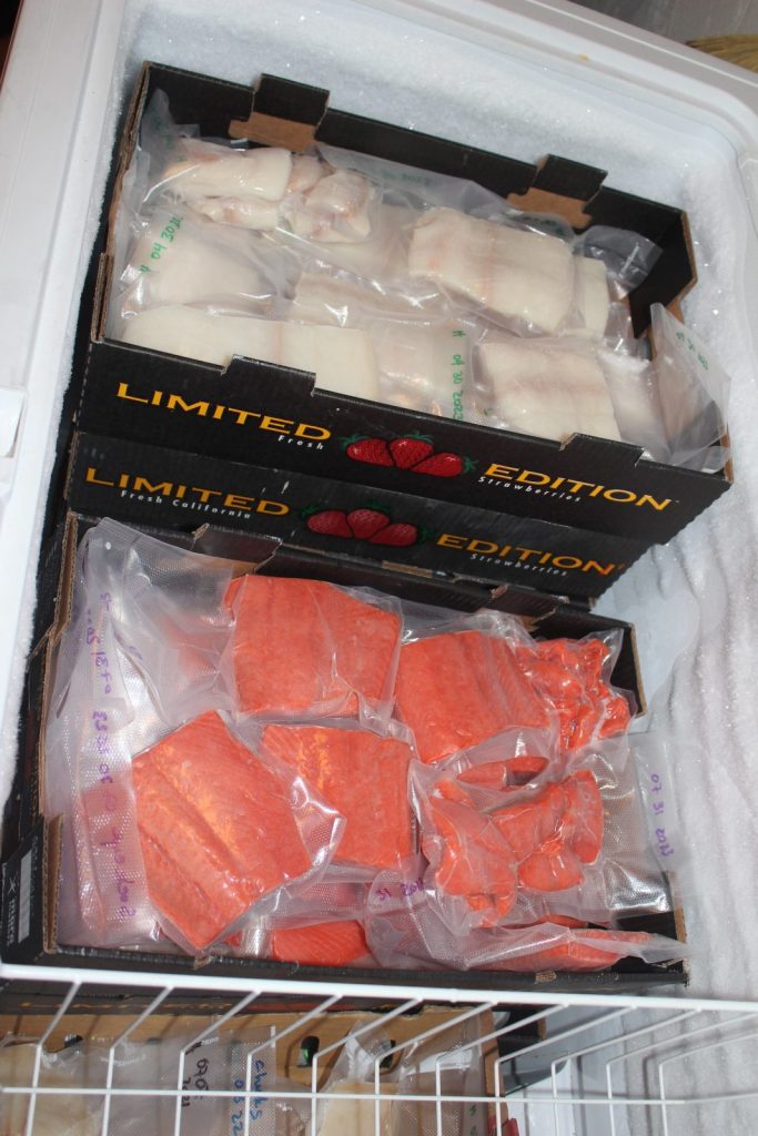 This is how we froze fish in a cannery I worked in. It works for poultry as well. 1) pre-freeze the fish hard. 2) dunk it twice in ice water–make the ice water a little more viscous by melting some honey in hot water (the cannery used corn syrup)-letting it cool- then dump it into the ice water). Quickly dunk each frozen fillet into the water. Dunk again. This forms a barrier of ice around the fish that keeps it from oxidizing. 3) Vacuum seal. Label with date and type of fish. It’ll be bullet proof in the freezer for over a year.