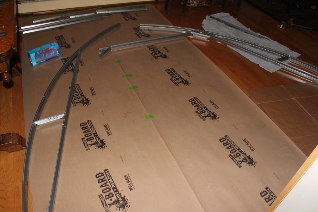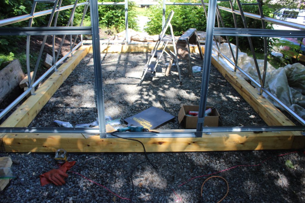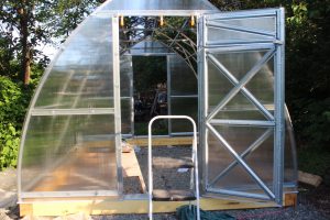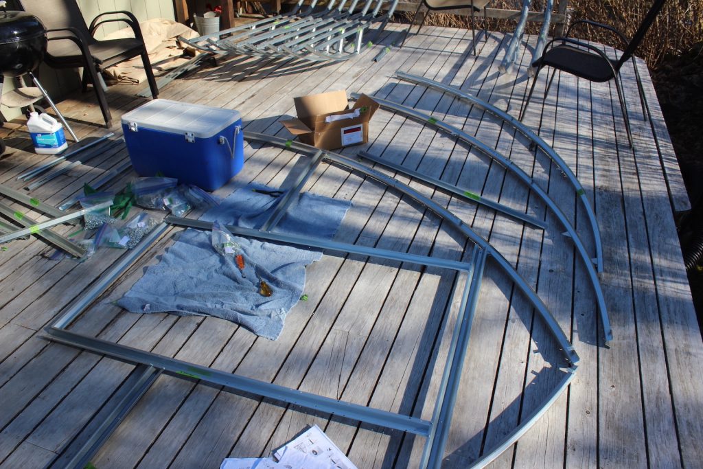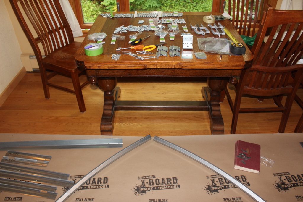 Next: Weather wasn’t the best when our greenhouse arrived so I assembled some of the components indoors to get a feel for how they come together. The X-Board is to keep sharp metal parts from scratching the floor. As things ended up, other project took priority and with winter coming on by the time I got back to the greenhouse, I stacked components for the winter wherever there was room. In my office, the mud-room, the shed, under the bed…