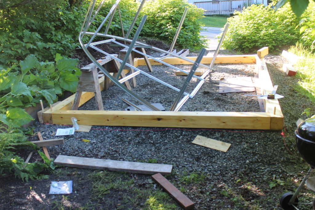 In spring: Once the gravel pad and wood foundation were in place, all the greenhouse parts moved out to the deck. Except (!) the polycarbonate sheets. Those stayed in the shed where it’s dry and cool until the frame was up. They want to stay out of the weather until you’re putting them on because there’s a thin sheet of protective film on both sides of the polycarbonate panels that can be hard to peel off if they sit in a hot place. (they rode out the winter in the unheated shed just fine). Note the polycarbonate sheets want to be stored in their boxes with the box standing on it’s long edge. That is, don’t lay them flat.