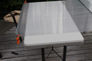 Note on panel size: roof and side panels are 1.05 meters wide x 1.974 meters long. As seen in photo above left, some of mine were 1.984 meters. That is, a centimeter longer than others. I cut off the extra centimeter with a utility knife. Photo right shows light clamps holding either end of a metal piece (called a profile) that I’m using for a guide to run the utility knife along. In the Planta videos, the techs do a lot of these cuts freehand but they do it for a living. I found I got a cleaner cut with the guide. Even if you don’t use it for a guide, you can use the profile to mark the line you’ll cut along.