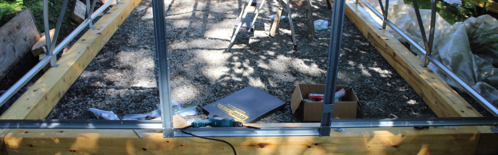 Next: Weather wasn’t the best when our greenhouse arrived so I assembled some of the components indoors to get a feel for how they come together. The X-Board is to keep sharp metal parts from scratching the floor. As things ended up, other project took priority and with winter coming on by the time I got back to the greenhouse, I stacked components for the winter wherever there was room. In my office, the mud-room, the shed, under the bed…