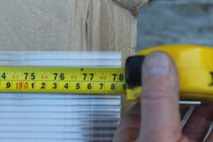 Note on panel size: roof and side panels are 1.05 meters wide x 1.974 meters long. As seen in photo above left, some of mine were 1.984 meters. That is, a centimeter longer than others. I cut off the extra centimeter with a utility knife. Photo right shows light clamps holding either end of a metal piece (called a profile) that I’m using for a guide to run the utility knife along. In the Planta videos, the techs do a lot of these cuts freehand but they do it for a living. I found I got a cleaner cut with the guide. Even if you don’t use it for a guide, you can use the profile to mark the line you’ll cut along.