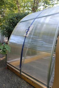 Once the polycarbonate skin is on, join the ridge sections all together on the ground. lay it on top of roof peak. Helps to have two people, at least 3 people for longer greenhouses. Align metal straps over the structure (carefully so you don’t scratch the polycarbonate). Attach straps to bands that you’ve secured to base. Cinch straps down. Put the handles on doors and windows.