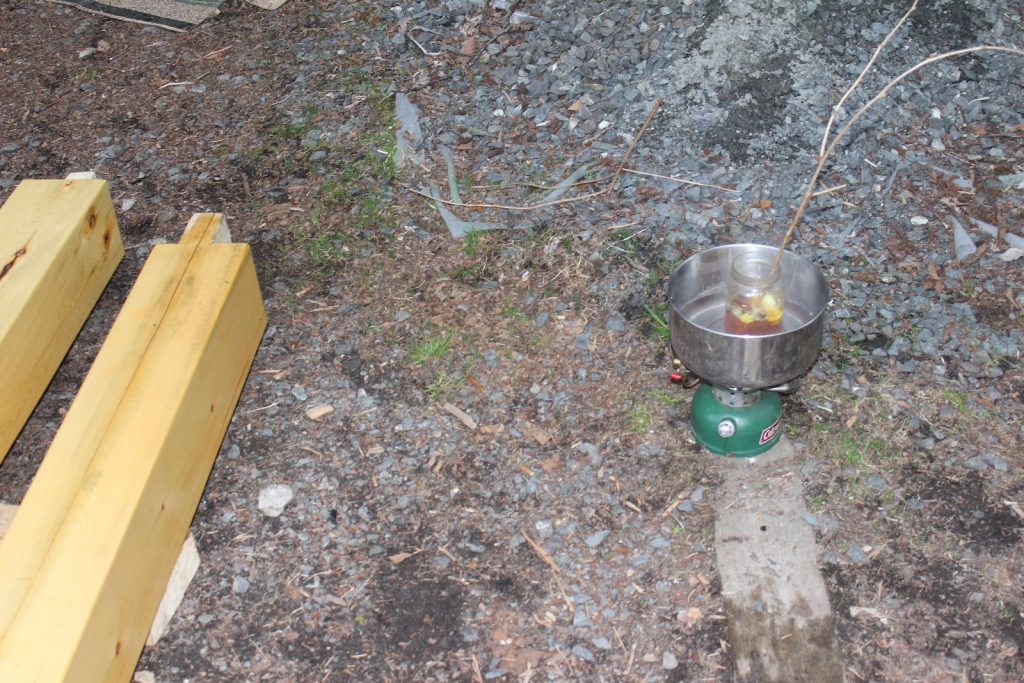 The plywood thing sitting on the beam is a guide to slip over the tenon to make sure it will fit.Lumber supply stores sell a waxy coating to paint on the ends of green timbers to minimize twisting and checking as the wood dries. Couldn’t find any in town so melted some chunks of beeswax (about 1/2 cup) in a jar with boiled linseed oil. As you see, the mix is in a pot of water on a camp stove. It’s outside because boiled linseed oil has a low flash point and if it caught fire the thing wouldn’t be in the kitchen. It worked out pretty well. I painted the beams with boiled linseed oil (no beeswax) too. Note: a local timber framer said he uses straight linseed oil to paint beams on the first coat because it soaks in more. Then he uses boiled linseed oil as a finish.Square up the base by making the diagonals exactly the same length.