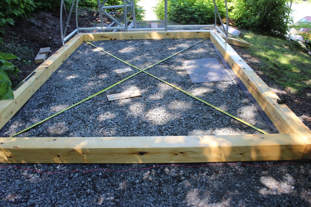 For connecting the greenhouse to the ground there are 3 options: T-shape metal feet you dig down a foot or so and back fill, or pour a concrete pad and bolt the greenhouse frame to it, or build a wooden base and secure the frame to that. I didn’t trust the metal legs to hold up in our climate, and pouring a concrete pad is like getting a tattoo for your yard. So a wood base it was. Anyway, I wanted to practice some timber frame joinery. Metal straps would work fine. I just like the aesthetics of mortise and tennon joints..