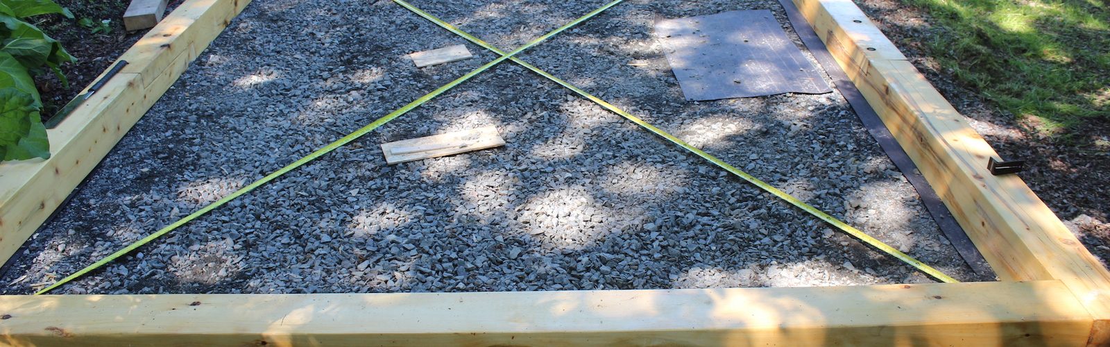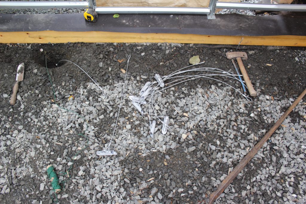 Duckbill anchors for insurance so the whole thing doesn’t blow away in a storm. The fat end is a toggle like a harpoon. That’s driven into the ground. If you follow the green twine to the hole between the trowel and the tape measure, you see a round metal thing like the head of a spike. That’s a driving rod. Because the soil is mucky under the gravel pad I dug the holes to get the toggles further down since they tended to pull up a couple inches before the toggle turned and caught. The loops at the other ends of cable will attach to cleats screwed into the base.