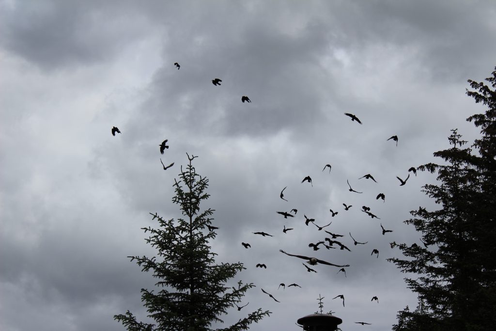 Crow colonies are a voracious organism. An old-time Juneauite told me crows had played a central part in wiping out the song birds that used to live in his neighborhood when he was a kid. That came home to me when a crow chased a juvenile red breasted sap sucker into our window one day. Bang! As the sap sucker flapped stunned on the ground, the crow pounced and tried to fly off with it alive in its mouth; and would have if I hadn’t chased it off.
