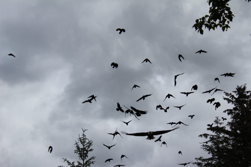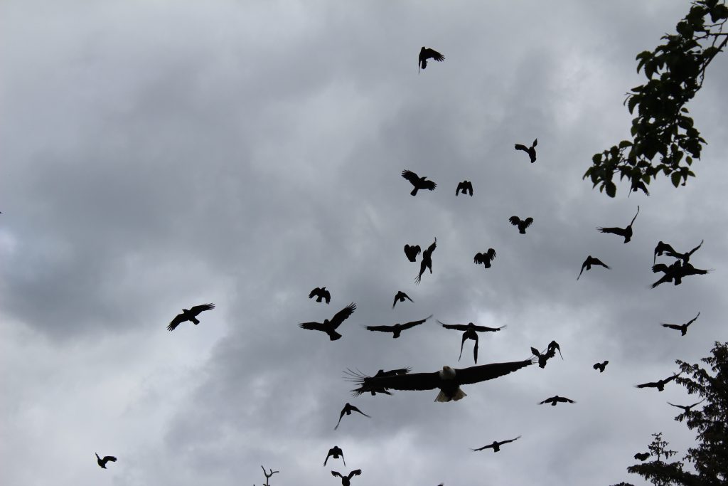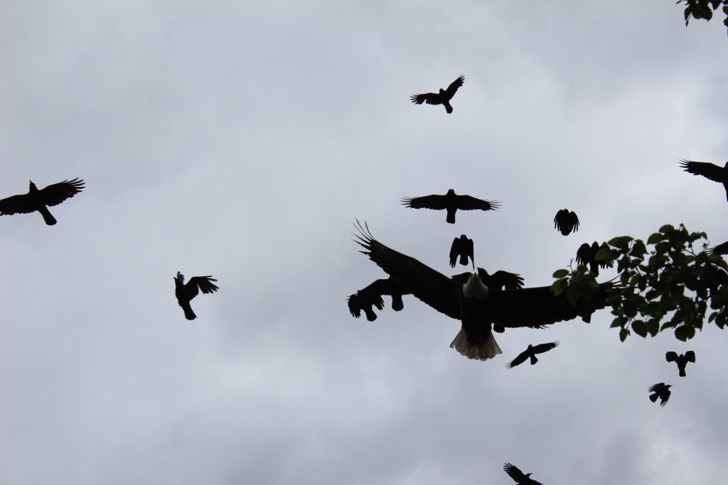 “They’re psycho crows!” my friend exclaimed. “Every day. Four o’clock in the morning. Caw! Caw! Caw! They’re driving me crazy.” I sympathized with her. It happens every year. Do nesting crows dive-bomb you when you walk the dog? Do they clean out your garden seeds? Do they use your car or the side of your house for target practice? There’s a solution. First a disclaimer: I know crows were here before we were and I admire their brains and clan fealty. I admire their bravery in spring, before the fish runs start, when some hungry ‘Bruce Willis’ eagle looks down at a crow colony guarding their chicks, says to himself, “Hey, I’m an eagle,” and plows right through a hundred crows attacking him from every direction. When an eagle hits a crow nest, the noise is terrific. Crows are pretty cool.