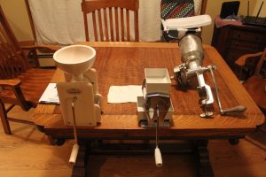 Grinders: Oh yeah, those. You can eat whole grains cooked as hot cereal, but if you want flour, you’ll want a grinder. Here are three: All hand crank because cranking is easy and needed when power goes out. Bear in mind that with low-end or rusted mills, some of whatever the grinding parts are made of will end up in your flour.