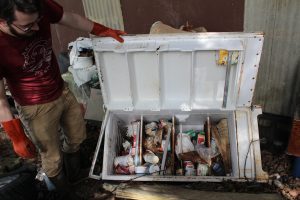 After pulling a few cubic yards of stuff away from the house we came to a large chest freezer, unplugged, loaded with  food that had long-since turned into the foulest goo you can imagine. Well, maybe not imagine. At least there wasn’t a dead body in there. Smelled like it, though. We pegged Don Roman as the source. In addition, he’d left coolers and backpacks of long expired food around the yard. Going bad to worse, he tried to blame it on Old Dave. The expiration dates on the food were years past when the old fellow died so we had no patience with that nonsense. I thought about cleaning the freezer out myself for maybe three or four seconds and decided this was a haz-mat job.