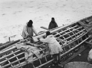 Umiak Construction by King Islanders Jesuit Missionaries Collection Rasmuson Library, Fairbanks circa 1945
