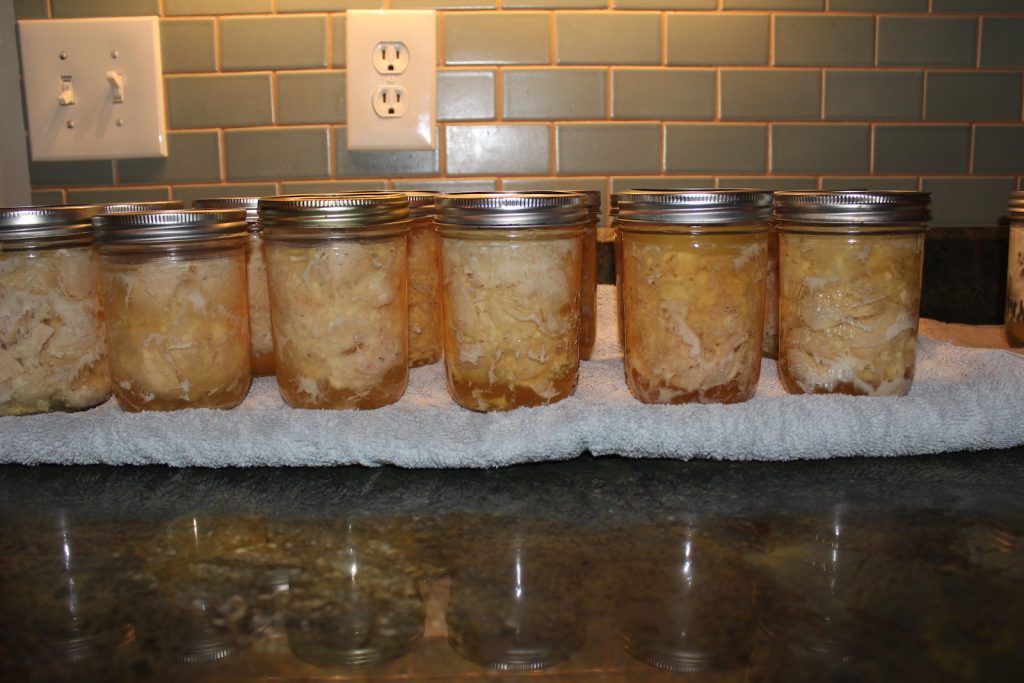 1) Bring the heat up slowly, starting between low and medium. 2) When steam starts venting from the petcock, let it vent 10 minutes. 3) put the weight on (10 pounds at sea level), let it heat until it starts to jiggle. 4) start your timer, for salmon it’ll be 100 minutes. 5) Turn the heat down slowly until you find that sweet spot where the weight jiggles about 6 times per minute. That’s what you want. It may take ten minutes or so of micro adjustments getting the heat to where you’re comfortable letting it ride on its own. At that point you can work nearby, play the guitar, or whatnot but you should stay close enough that you can hear the cooker vent to make sure all is well. 6) when cooking time is up, turn off heat. Don’t take the weight off. Just let it cool down on its own until there’s no pressure in the cooker. Then you can take the weight off, open the lid, and remove the jars. Pick them out straight up using the jar remover. They’ll keep boiling for a few minutes after they come out of the cooker. The lids start to pop as they seal. Pat yourself on the back. You’ve got 14 pints of high quality protein for next winter. Well done!