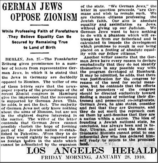January 28, 1910 German Jews disavow Zionism in Hamburg as the Zionists Conference there tried to conflate Jews with Zionism. The Germans quoted in the Los Angeles Herald were clear they were German citizens who wanted no part of moving to Palestine.